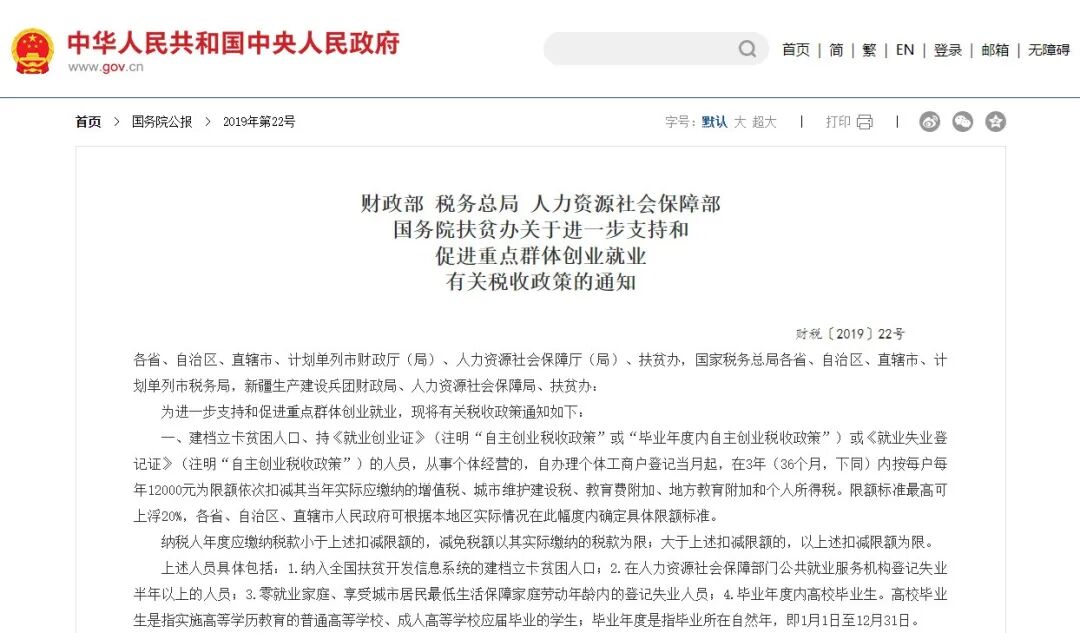 《關(guān)于進一步支持和促進重點群體創(chuàng)業(yè)就業(yè)有關(guān)稅收政策的通知》(財稅〔2019〕22號)